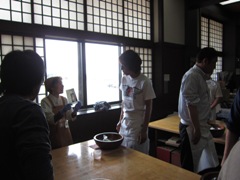 | そばの里 看板娘と会長 | そば作りの工程を真剣に聞く野村さん | みんな真剣です |