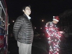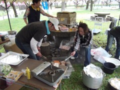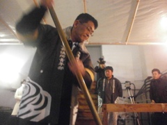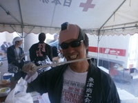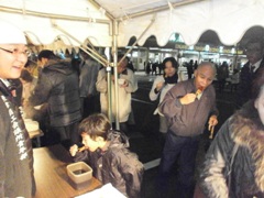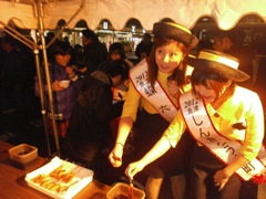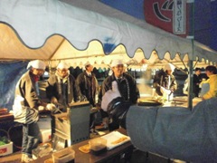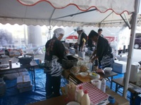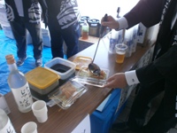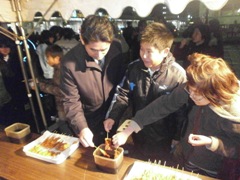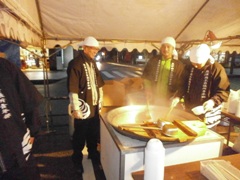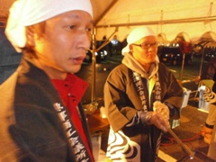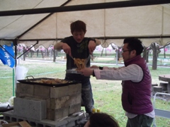 | テントを張り寒さ対策も万全です | 本職の技を披露(?!)した成瀬君(左) そして元祖Mr.BBQ牧野副会長 |