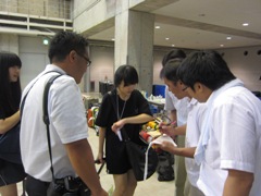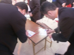 受付係の林君(左)辻口君(中央) 入念なチェックをする河ア専務(右) |