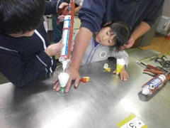 景品をGETして喜ぶ寺田さんの子供さん お父さんに報告しています |