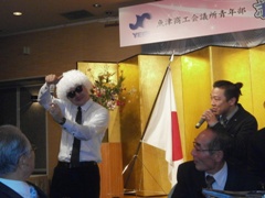 今回の新年祝賀会は、澤崎魚津市長をはじめ、多数の来賓の方々が出席され、ホテルサンルート魚津にて盛大に開催しました。純米吟醸じゃんと恋魚津での乾杯から始まり、料理に当会地域発信委員会が中心となり開発したB級グルメ「魚津カツ」や5月に開催される新しいお祭りのPR、マジシャンTOMMYさんによるテーブルマジックと盛り沢山な内容でした。中締めには、県議会議員である稗苗清吉氏の万歳をいただき、返礼として当会次年度会長予定者である有磯英和君が万歳を行い、今年一年の皆さんの御多幸を祈念しました。
