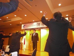 | 青年部があったからこそ今の自分があると語られた加藤先輩 | 有磯次年度会長による万歳 | 返礼をされる山形先輩 |
