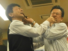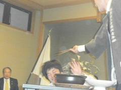 | テーブルカードマジック | 千田副会頭、大愛副会頭もびっくり | ここのテーブルではフォーク曲げ |