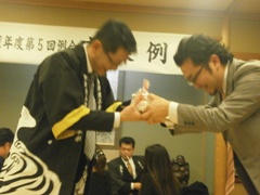 | 経塚先輩に記念品を | 宮崎先輩へ記念品贈呈 | 見つめあう二人…ではなく 山形先輩へ記念品贈呈ですw |