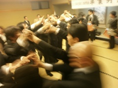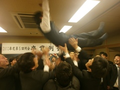 | 恒例の胴上げです☆ | 加藤先輩はホントに嬉しそう | ボケボケですが、アーチでお見送りです |