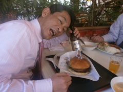加藤監事は手作りバーガー☆ 顔ぐらいある大きなバーガーにびっくり! |